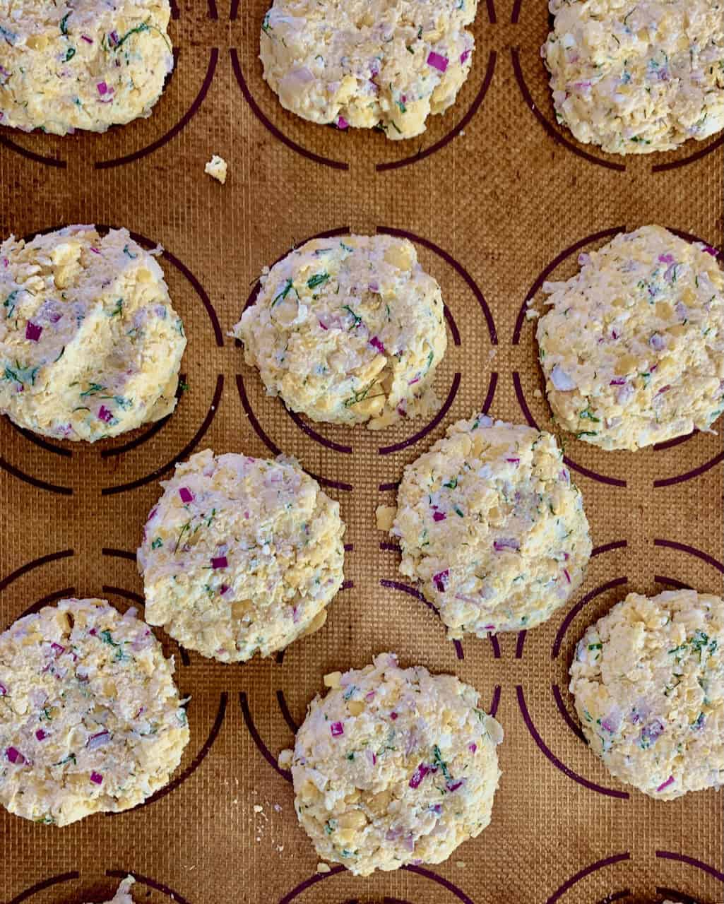 Scoop the mixture into golf ball-sized balls, and form them into patties. You can spray (or brush) the tops with a bit of oil to help them get a bit golden.