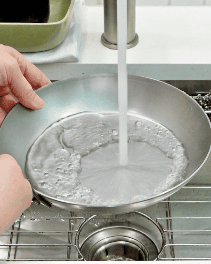 - Wash your new carbon steel pan with hot water to remove the protective beeswax coating