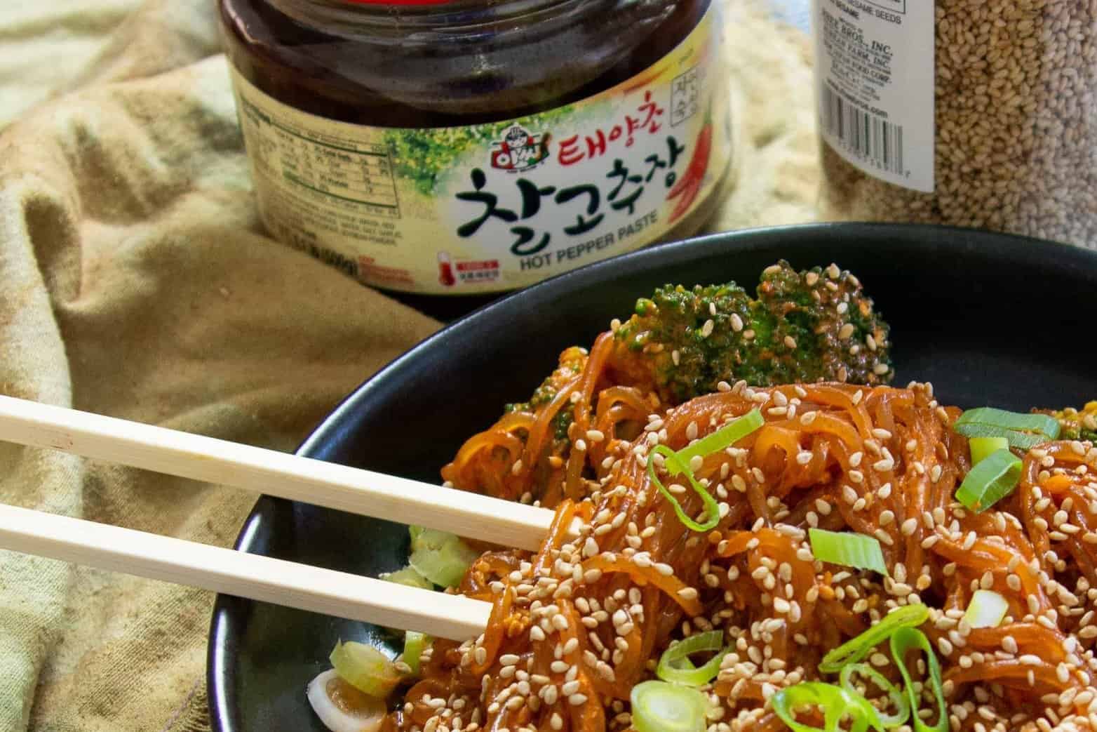 Yum! I LOVE glassy sweet potato starch noodles (aka cellophane aka dangmyeon)! I didn’t have cream cheese but I subbed for some sour cream and it still gave a nice thick creaminess. A whole clove of minced raw garlic was a bit much for me - next time, I might try to cook the garlic a bit in the sauce and toss back in the noodles or just use less of it! Finally - and this honestly may have been because I used sour cream, although cream cheese also has a bit of a tang - I felt that something was missing. I added a touch of honey to balance the flavors and give it that classic Korean sweetness, and it was perfect!