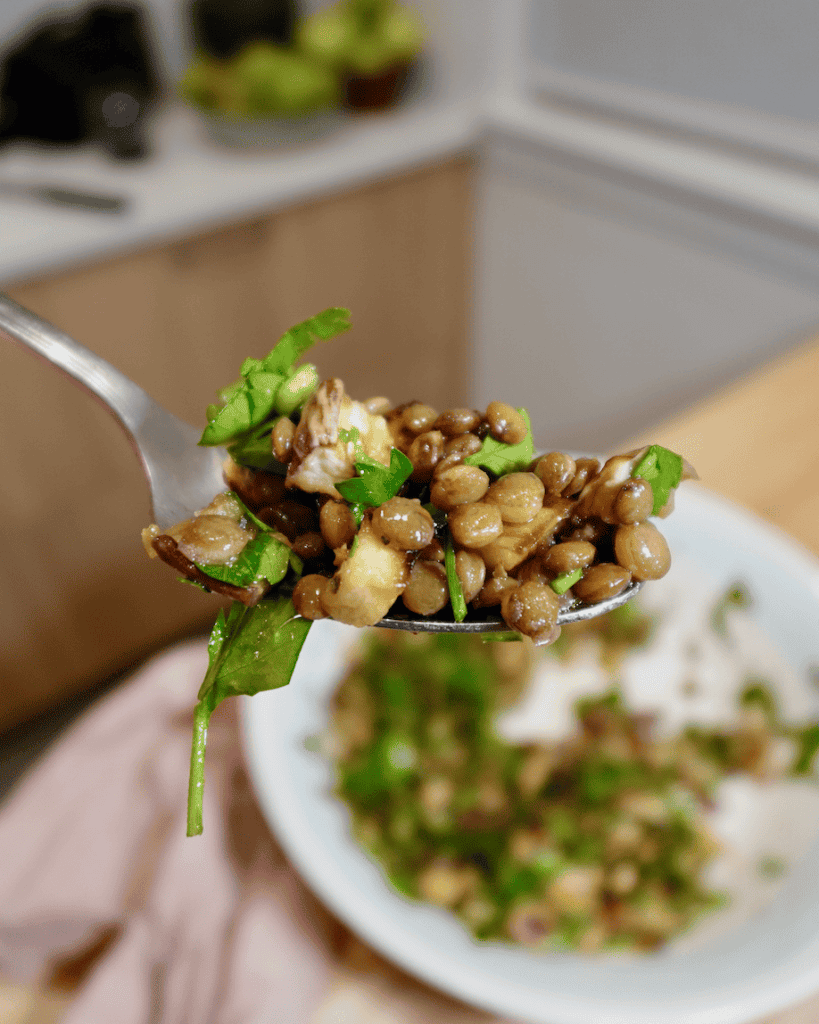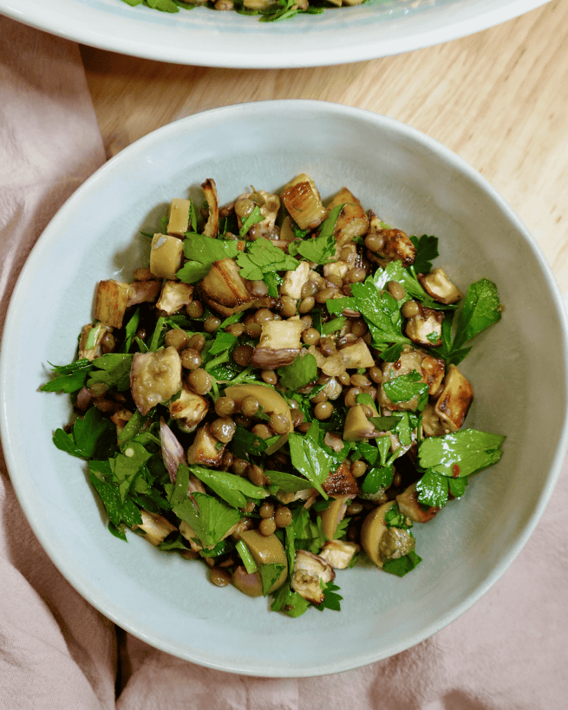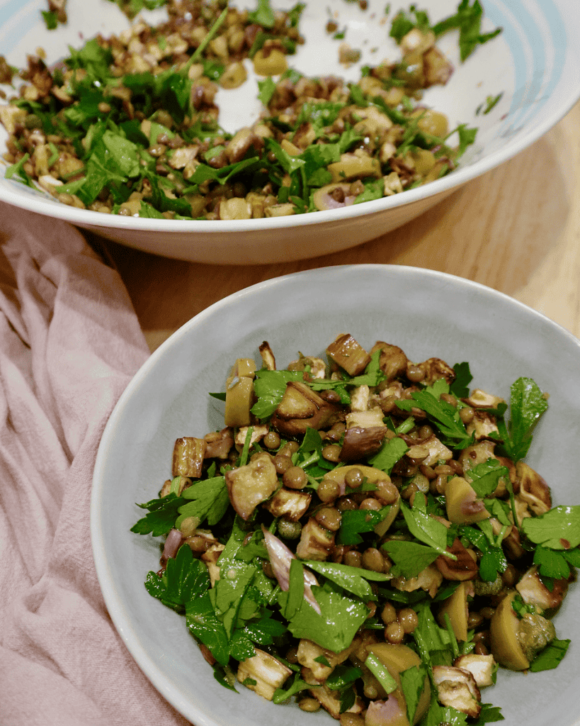 - Once cooled, add the eggplant to the lentil mixture, toss with the dressing, and serve.