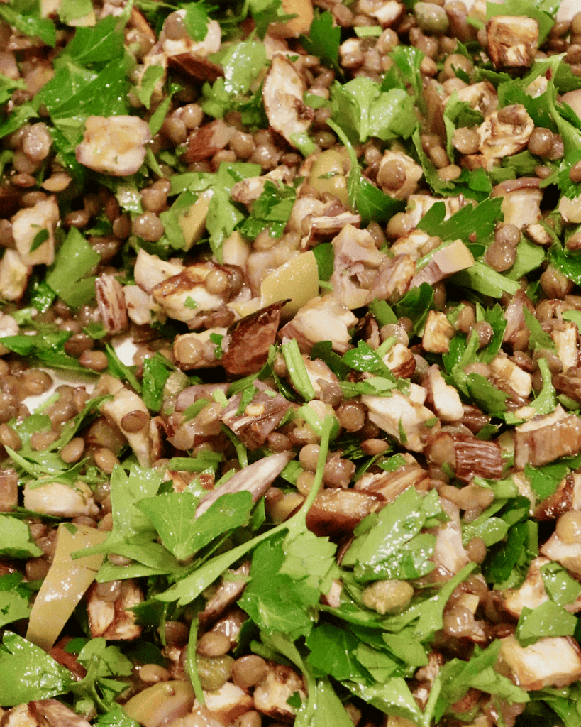- While the eggplant cooks, chop the parsley and olives, and toss them into a large bowl with the lentils and capers.