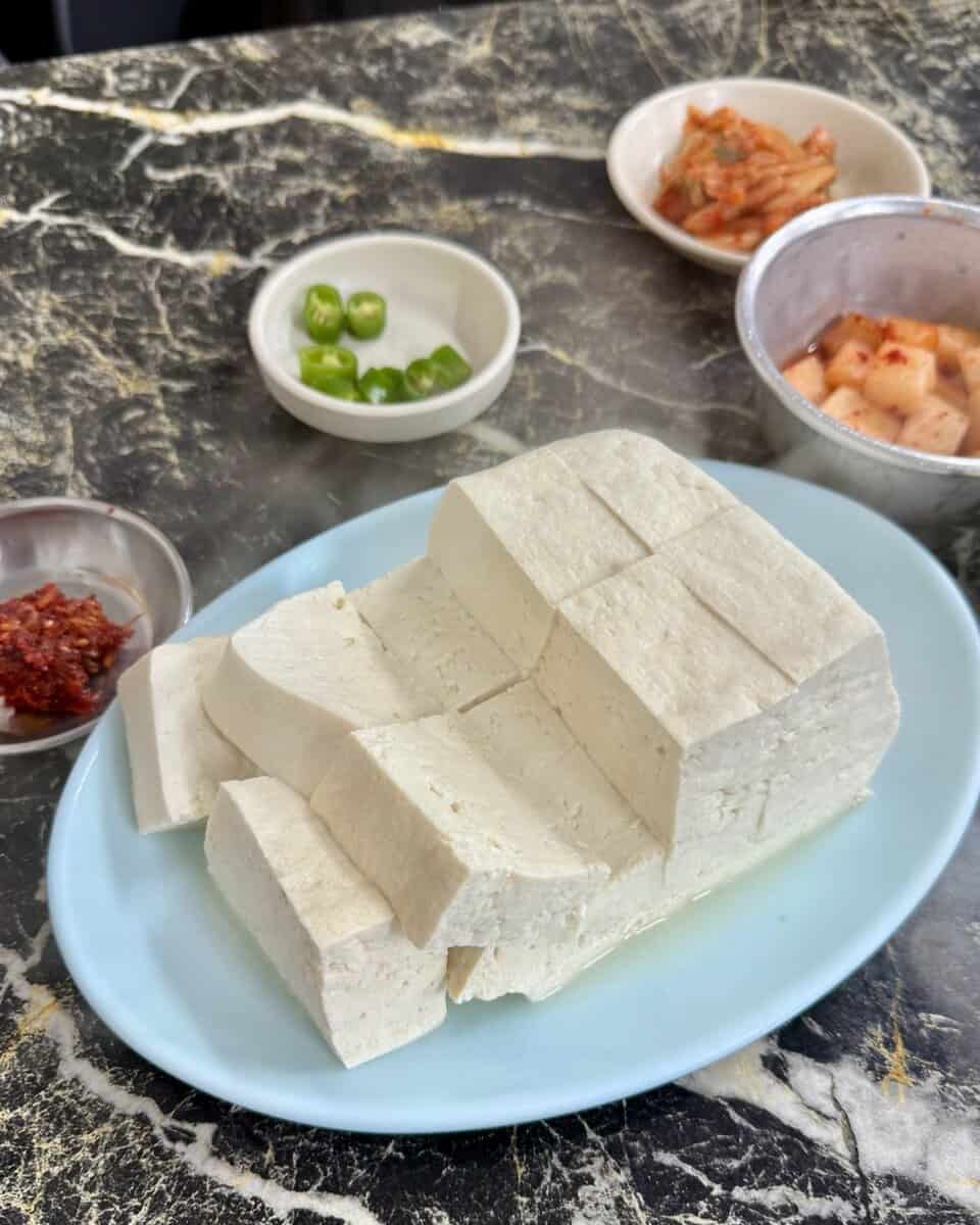 One of my favorite meals was at Acheson Grandpa Tofu. They gave me a giant, steaming block of freshly cooked tofu with kimchi, fermented anchovies, and other little side dishes, all for about seven bucks. It was simple, fresh, and delicious.