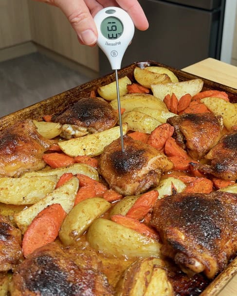 I love using potatoes and carrots with these honey mustard chicken thighs because they are hearty and hold up well to the long roasting time. The potatoes and carrots soak up all the savory chicken juices (and yes, some delicious chicken fat too) making them incredibly flavorful and tender.