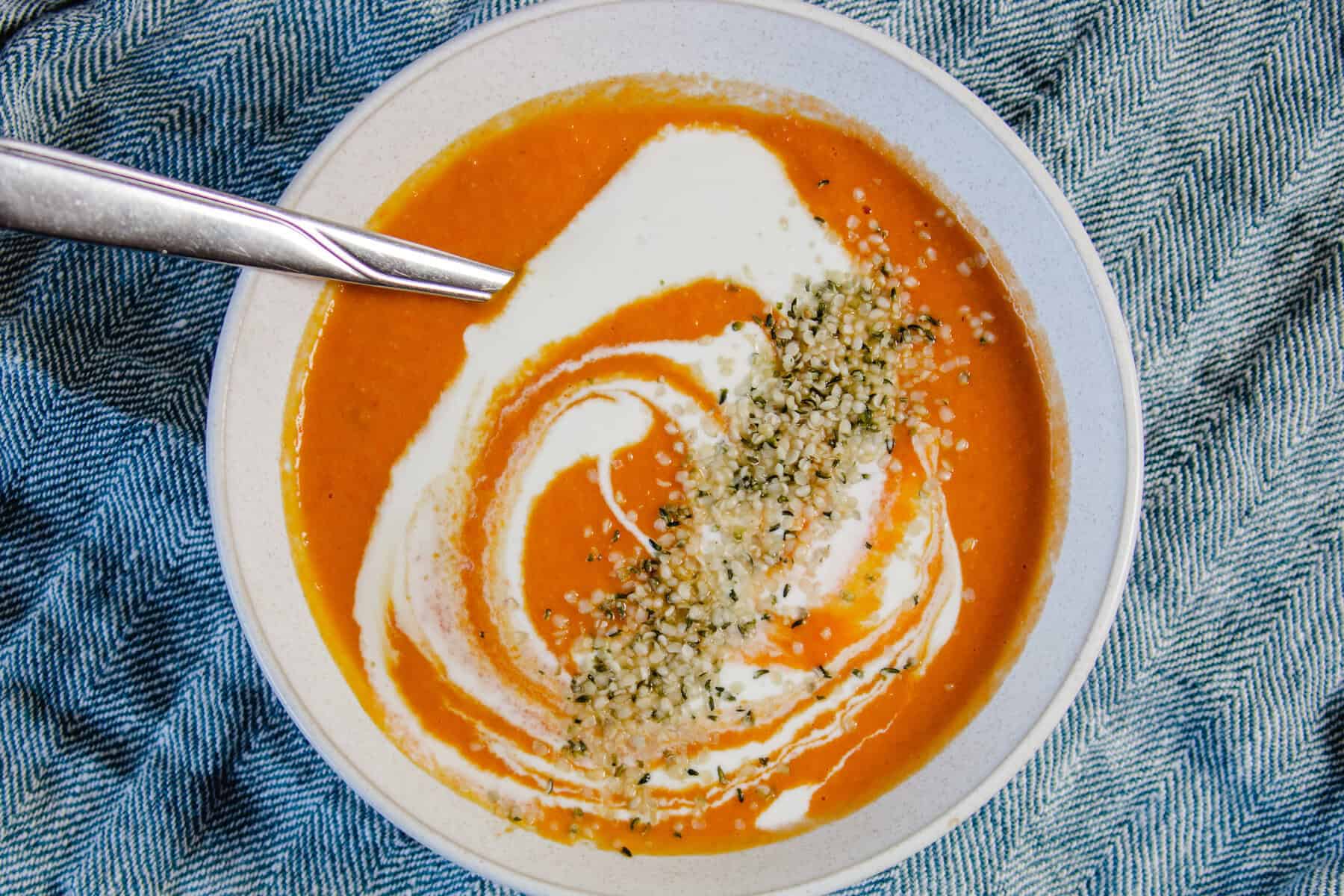 This quick and easy creamy tomato soup with coconut milk only takes about 20 minutes to make. It’s flavourful enough to satisfy any adult, but it’s also not too spicy, so kids love it too.